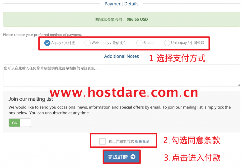 HostDare 中文网整理 HostDare VPS 新用户注册教程、VPS 购买教程,支付方式支持支付宝、微信支付等,非常方便,全程也很简单,我们只需要选择需要购买的方案,使用优惠码,注册一个账户,然后完成购买即可,全程只需要几分钟。而且 HostDare 网站目前支持中文,我们购买的时候不会存在语言上的障碍。